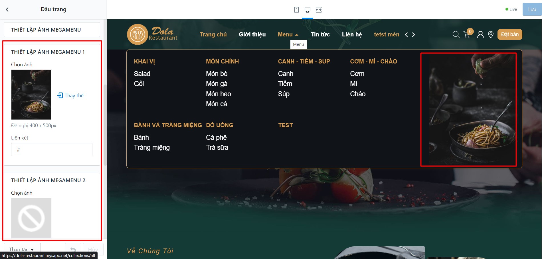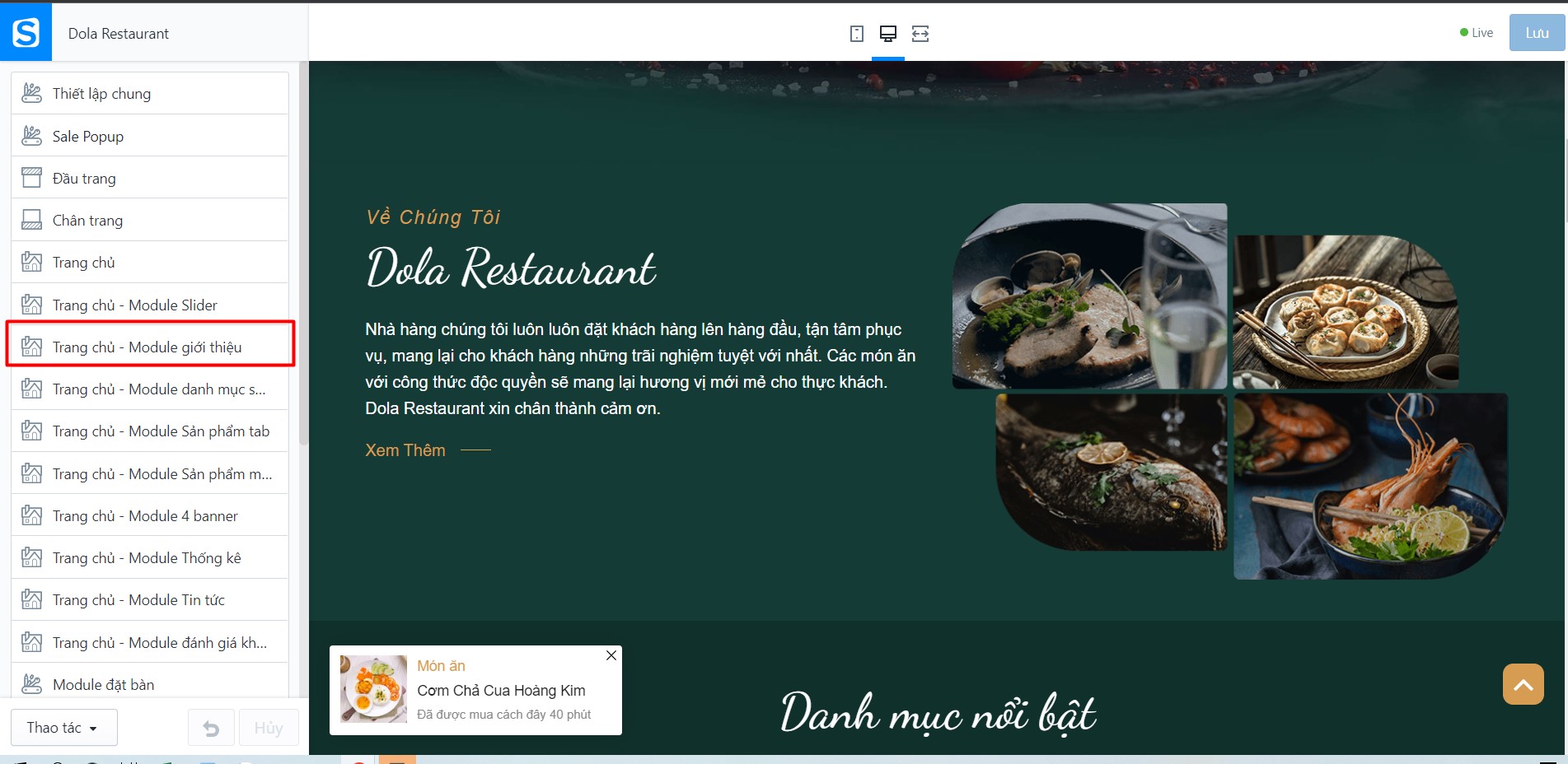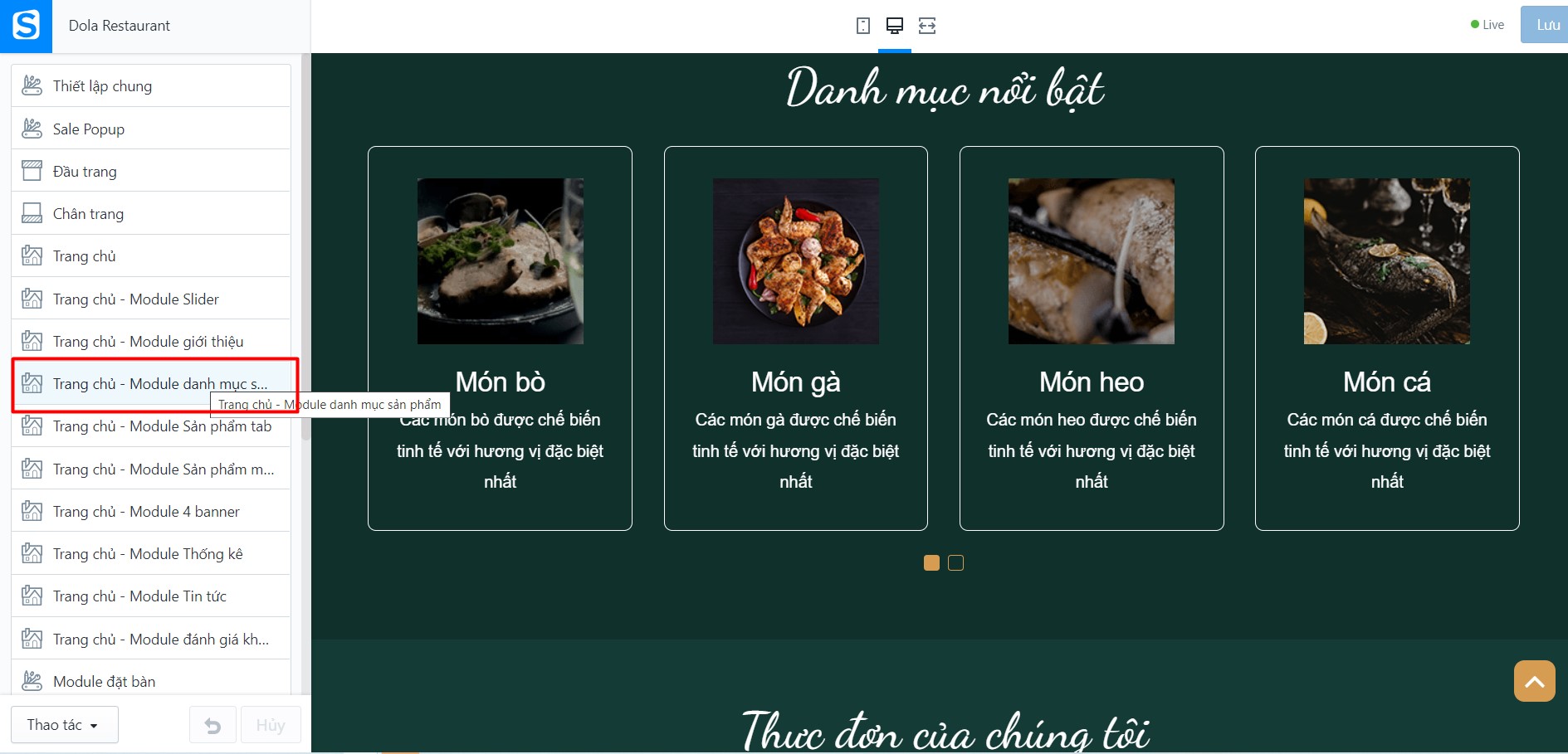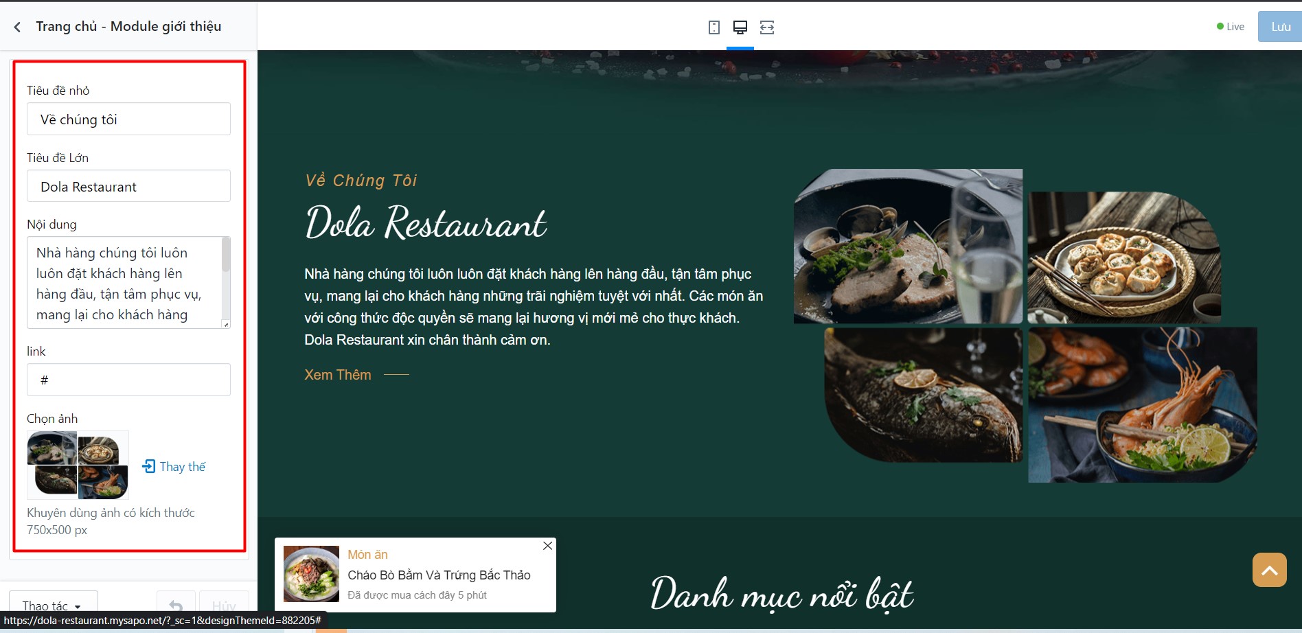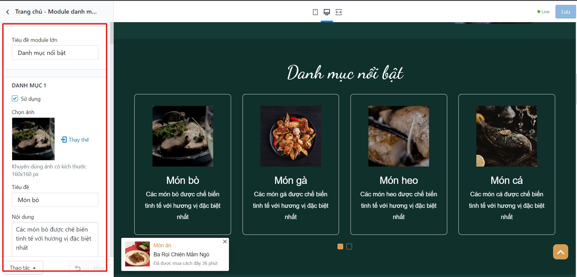 Tại đây bạn thiết lập các danh mục món ăn nổi bật của nhà hàng, thiết lập bao gồm ảnh, tiêu đề, nội dung, liên kết, ...:
