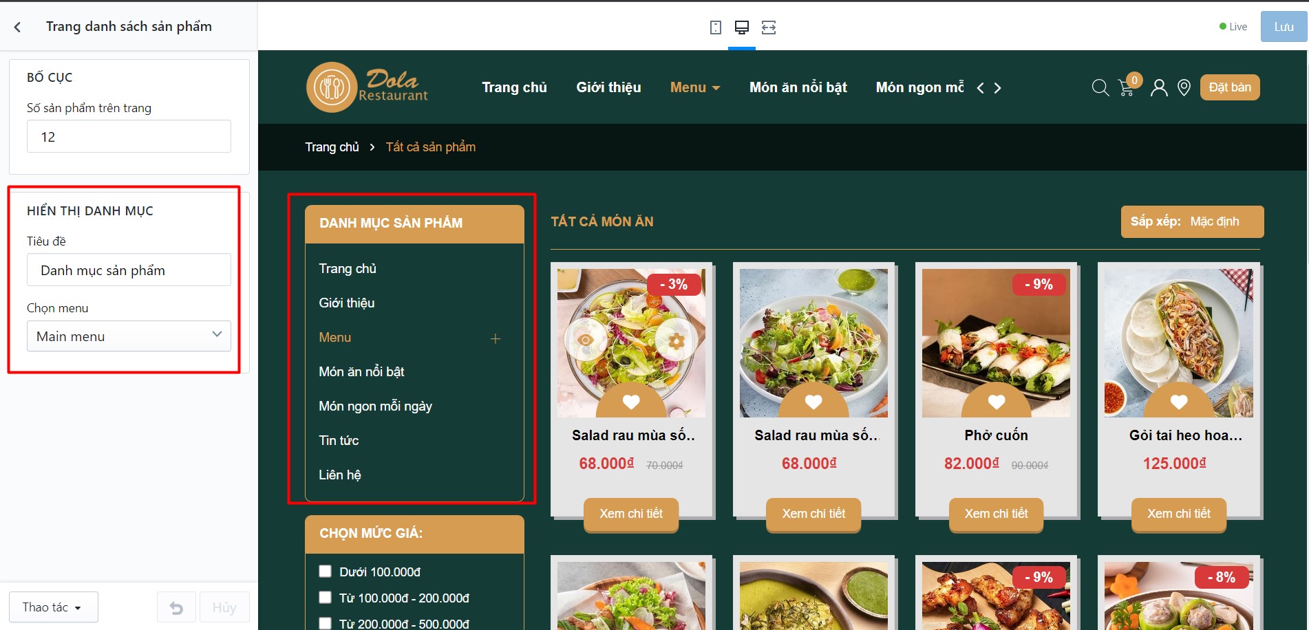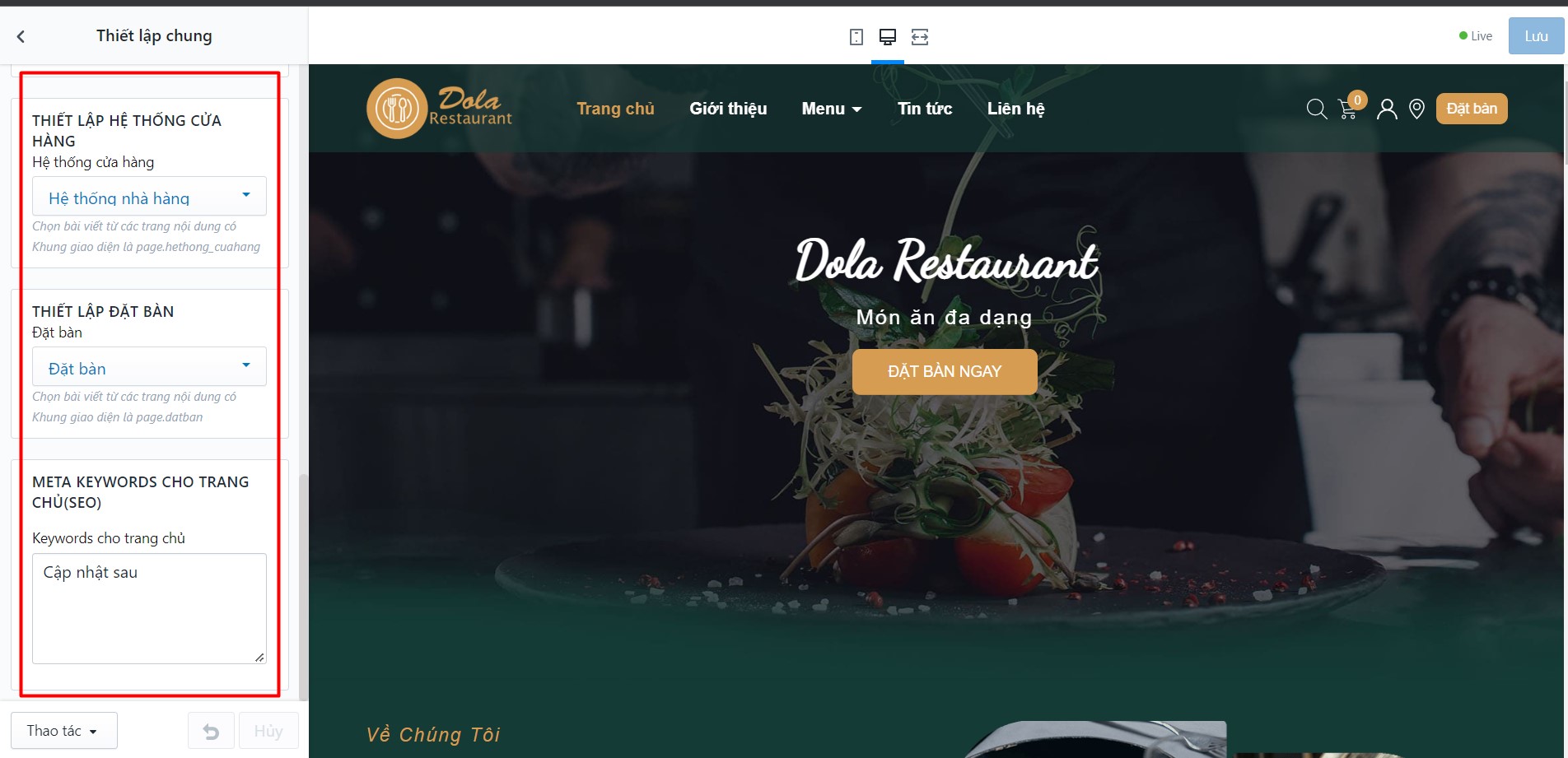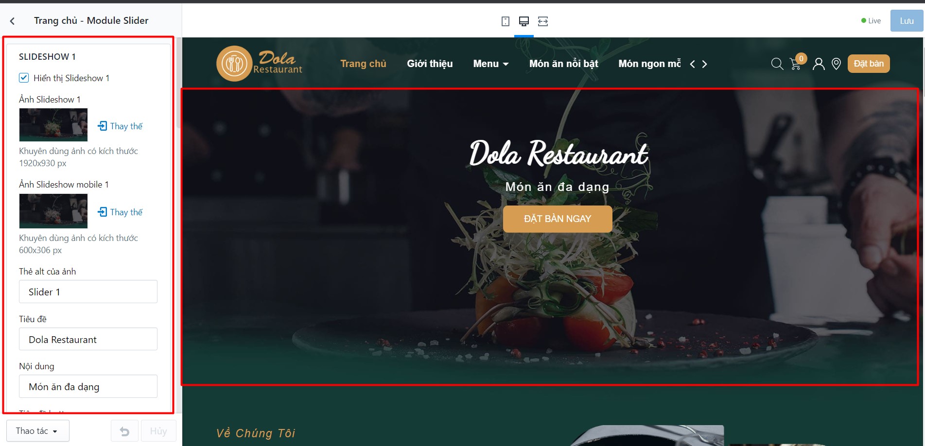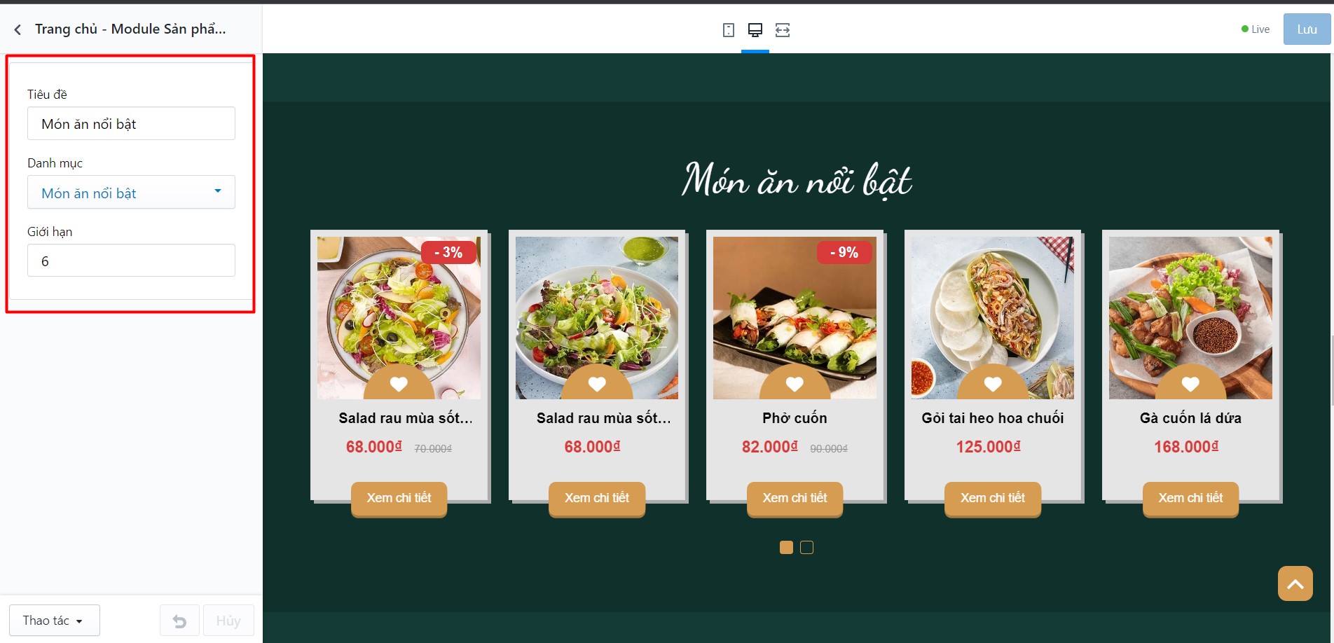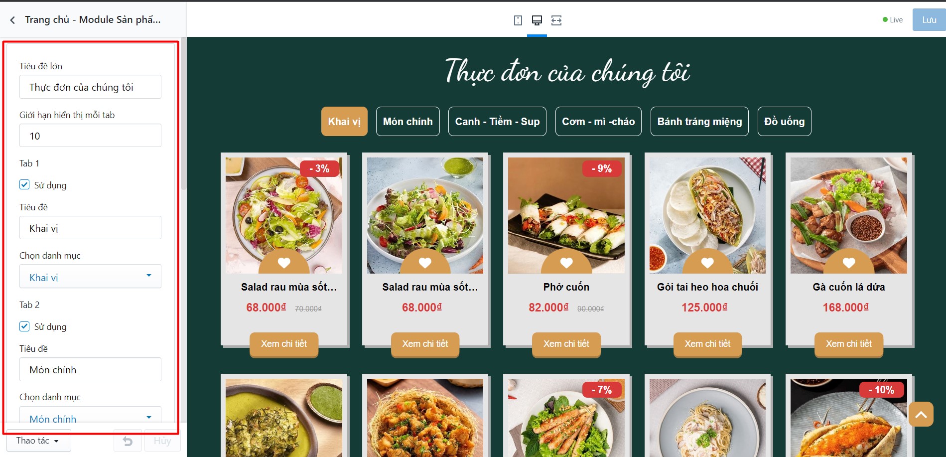 Tại đây bạn thiết lập các danh mục món ăn nổi bật của nhà hàng, thiết lập bao gồm ảnh, tiêu đề, nội dung, liên kết, ...: