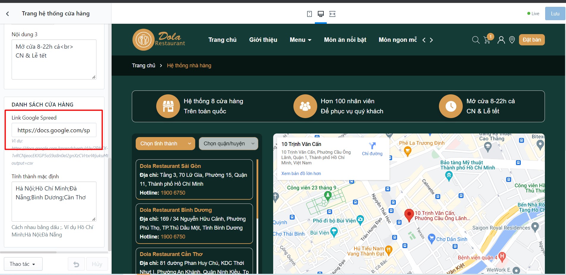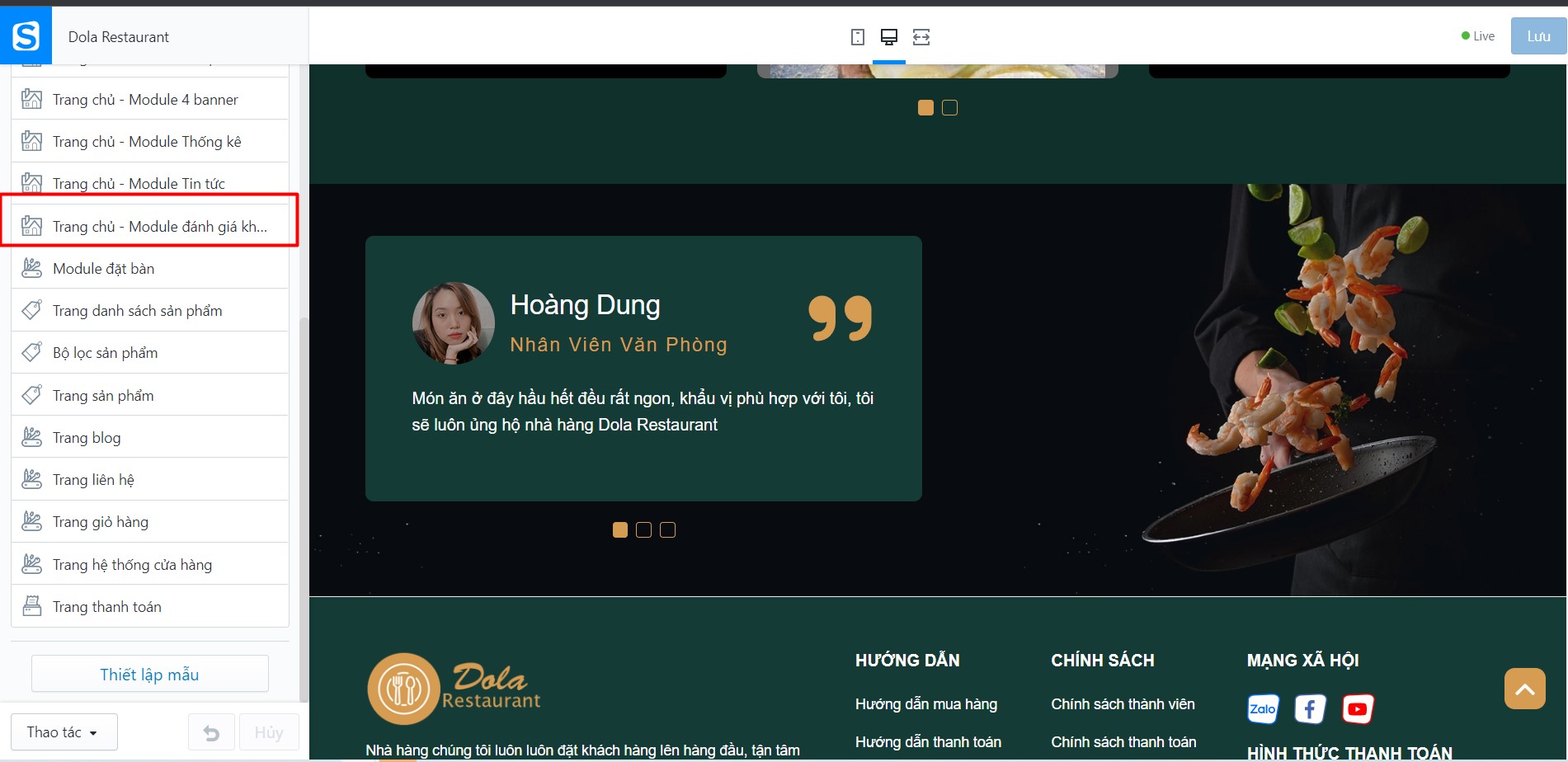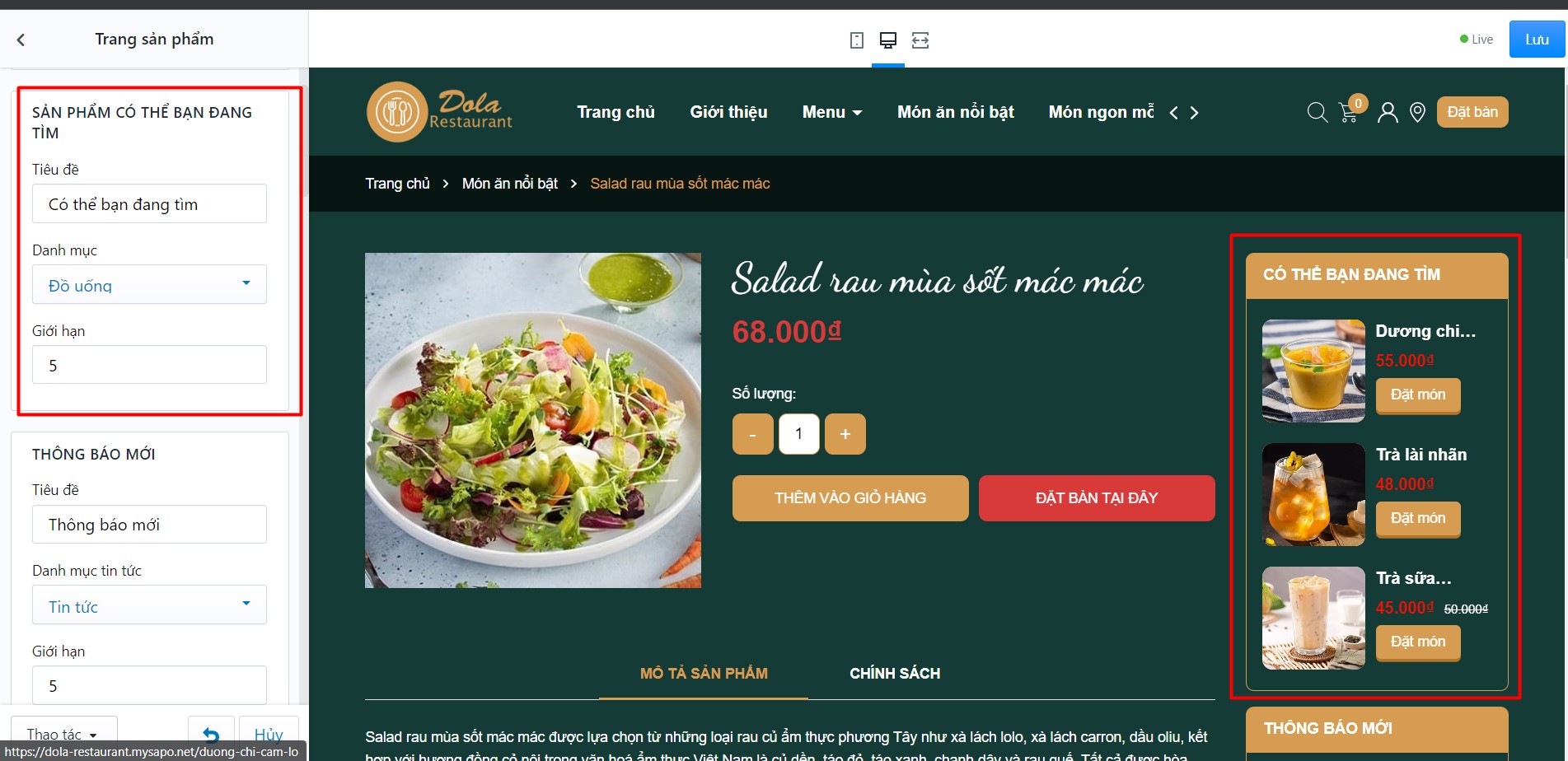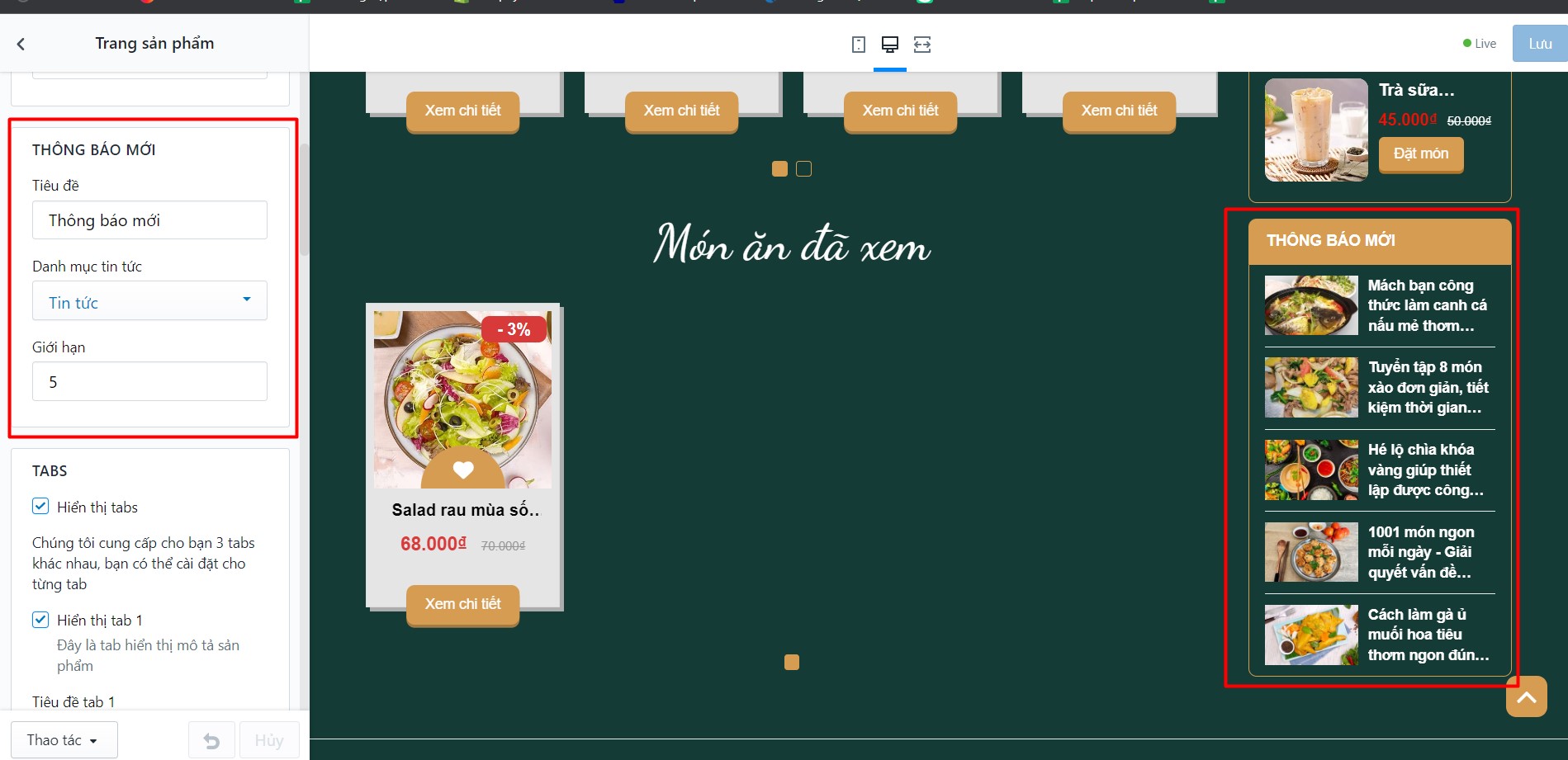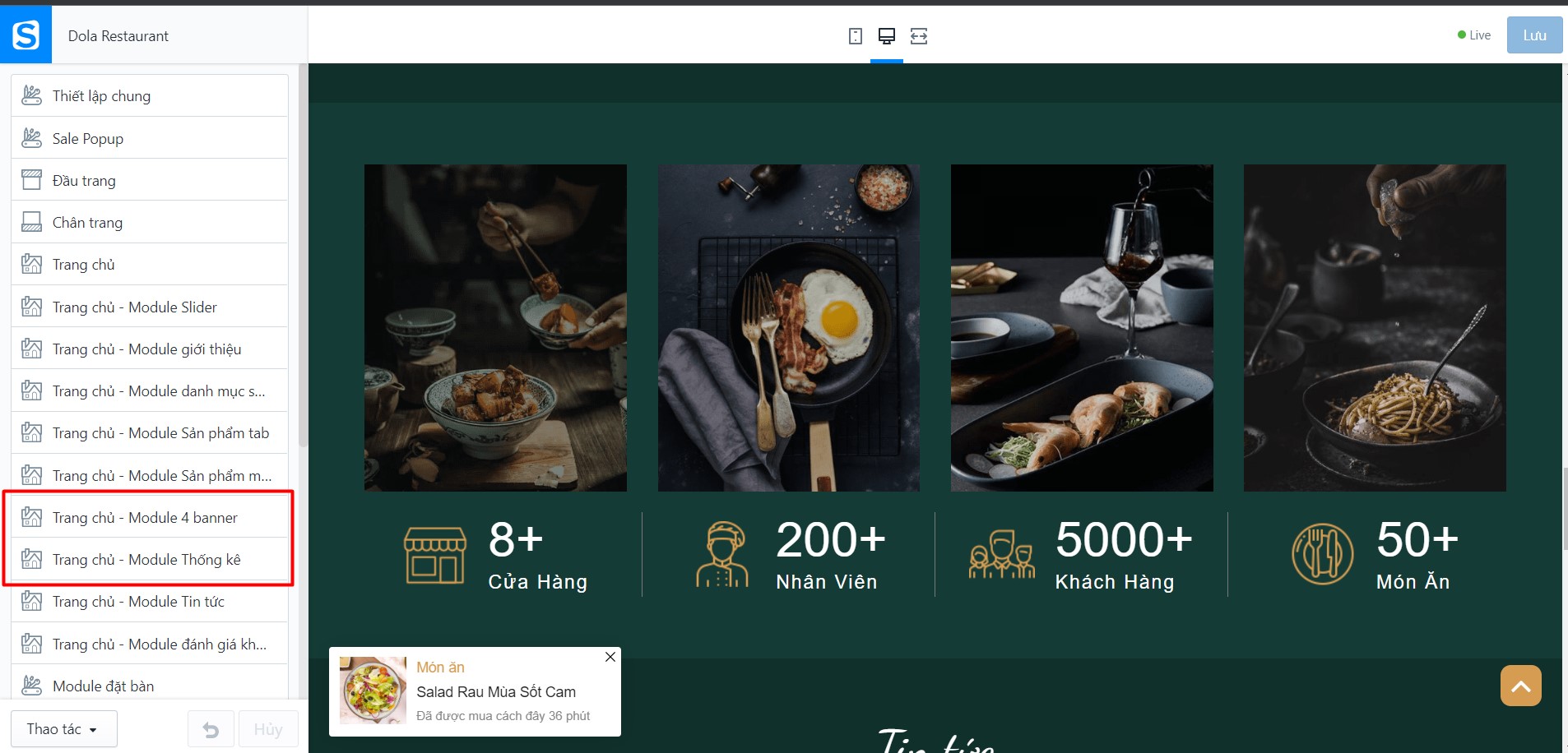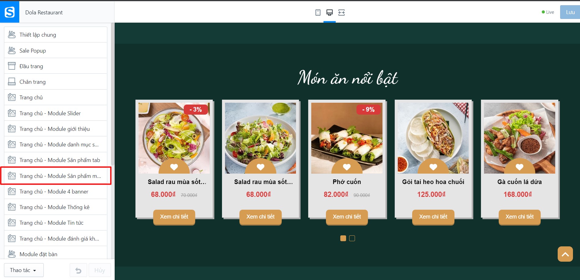 Tại đây bạn thiết lập các danh mục món ăn nổi bật của nhà hàng, thiết lập bao gồm ảnh, tiêu đề, nội dung, liên kết, ...: