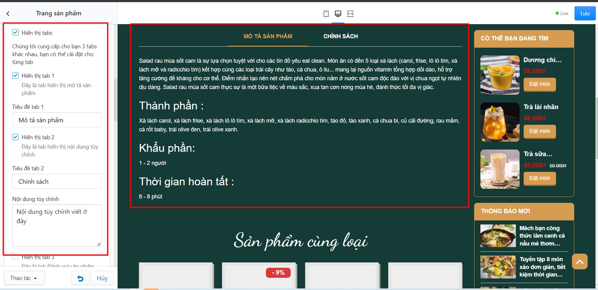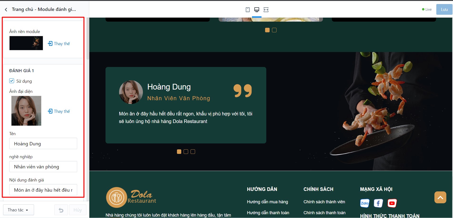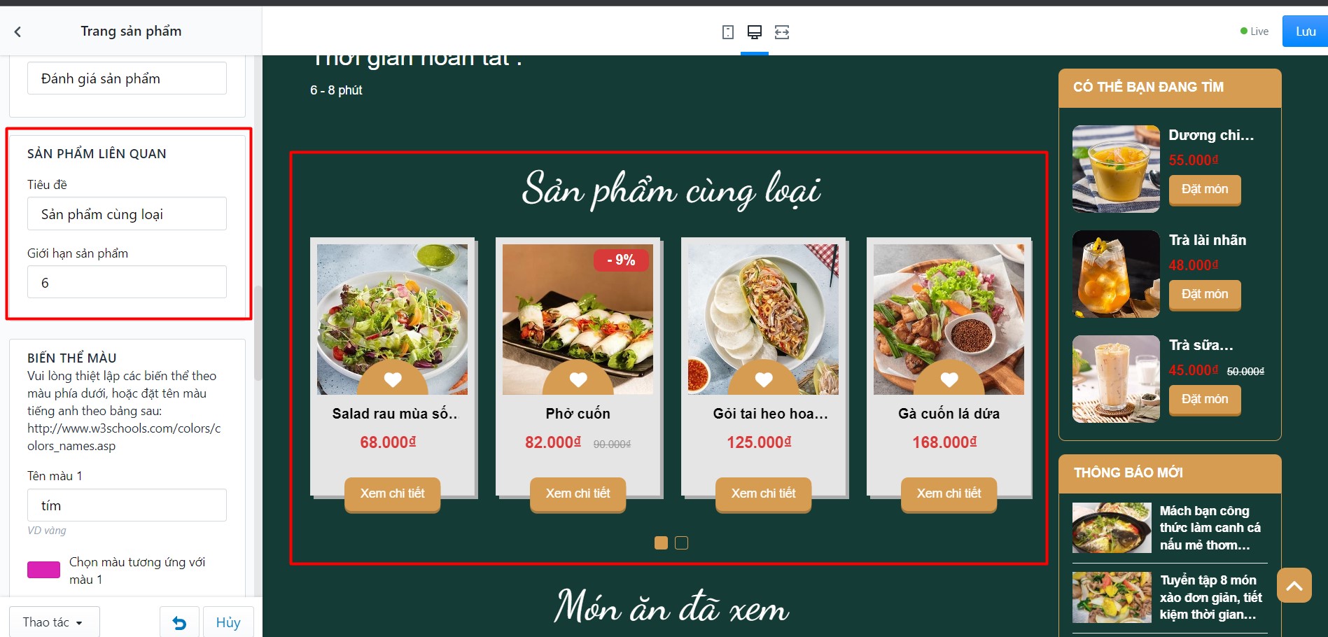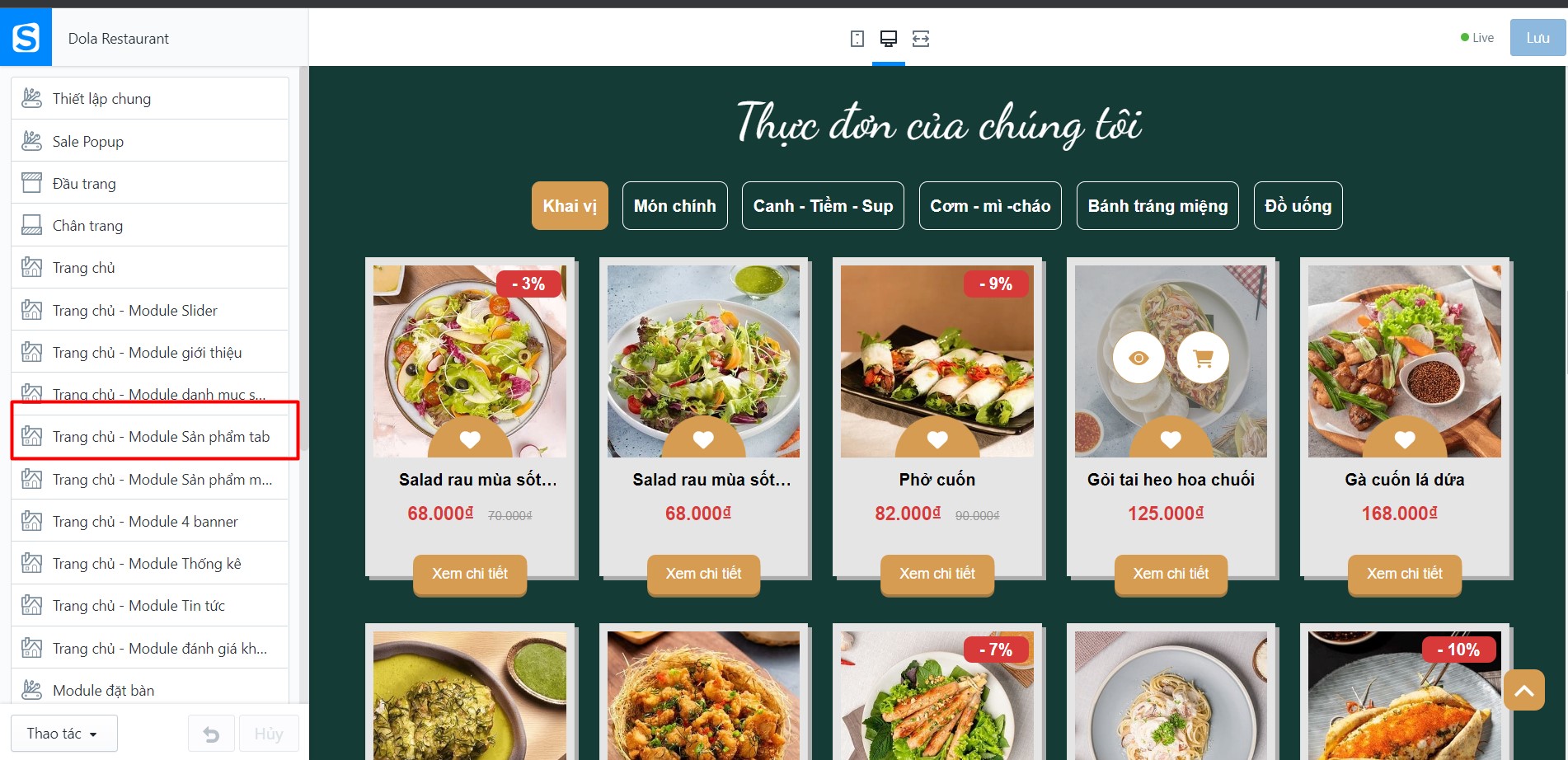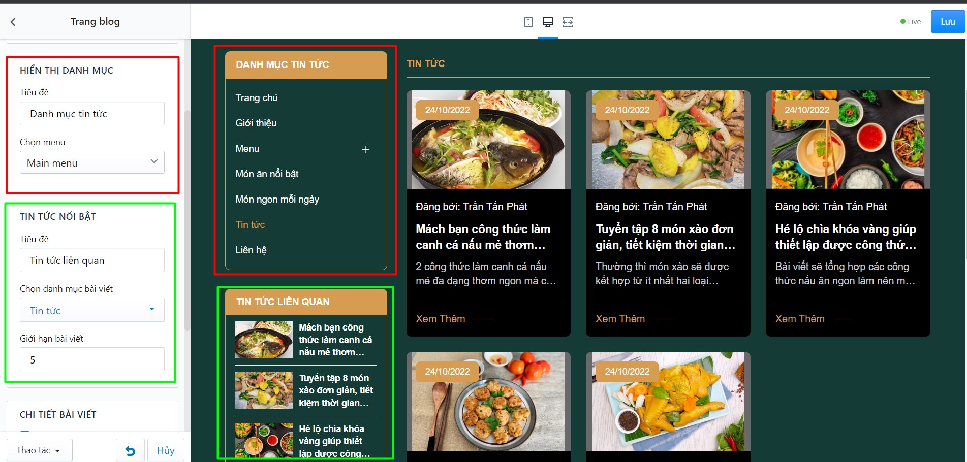 Tại đây bạn thiết lập các danh mục món ăn nổi bật của nhà hàng, thiết lập bao gồm ảnh, tiêu đề, nội dung, liên kết, ...:
