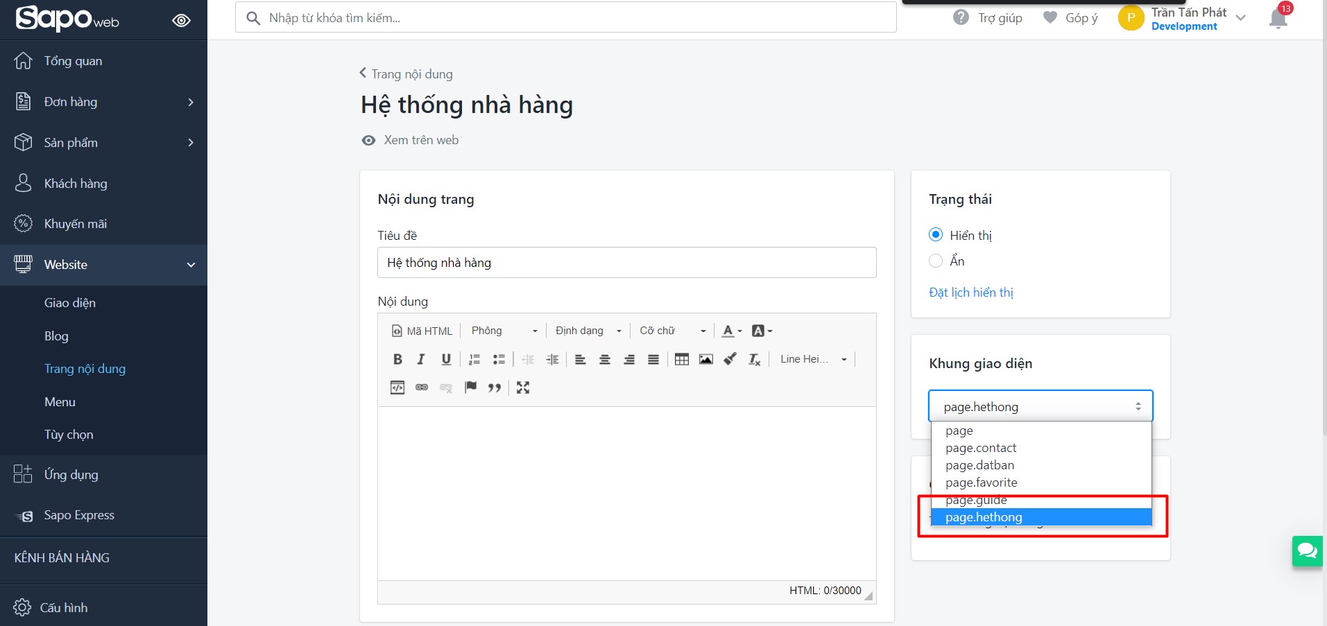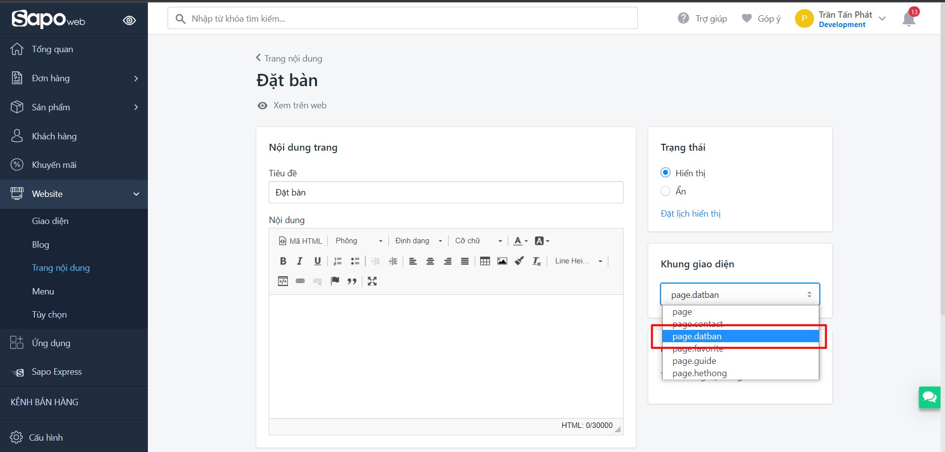 Đầu tiên bạn tạo trang nội dung và chọn khung giao diện page.datban