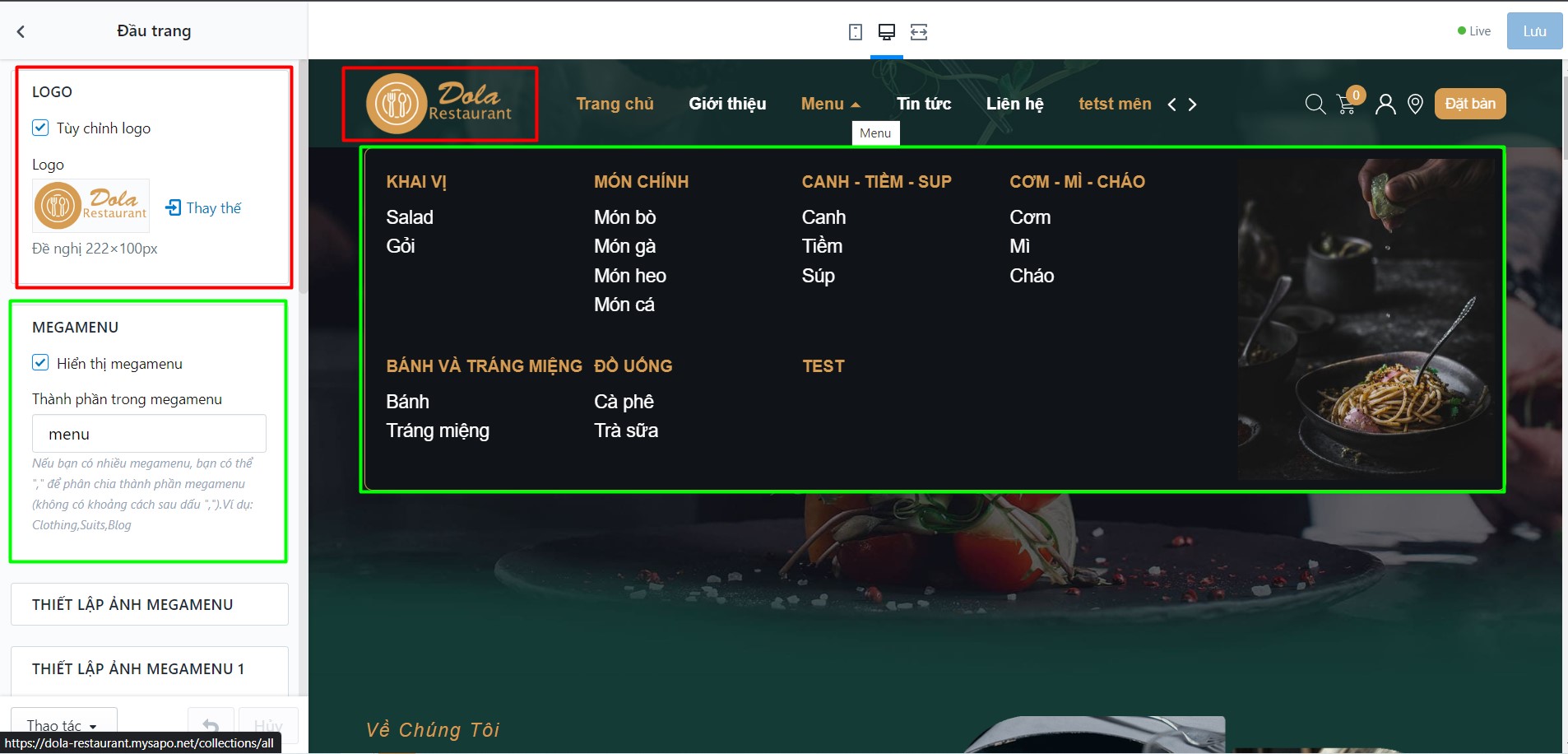 Tại đây cho phép bạn thay đổi tất cả các logo, Menu, Mega menu, ảnh mega menu: