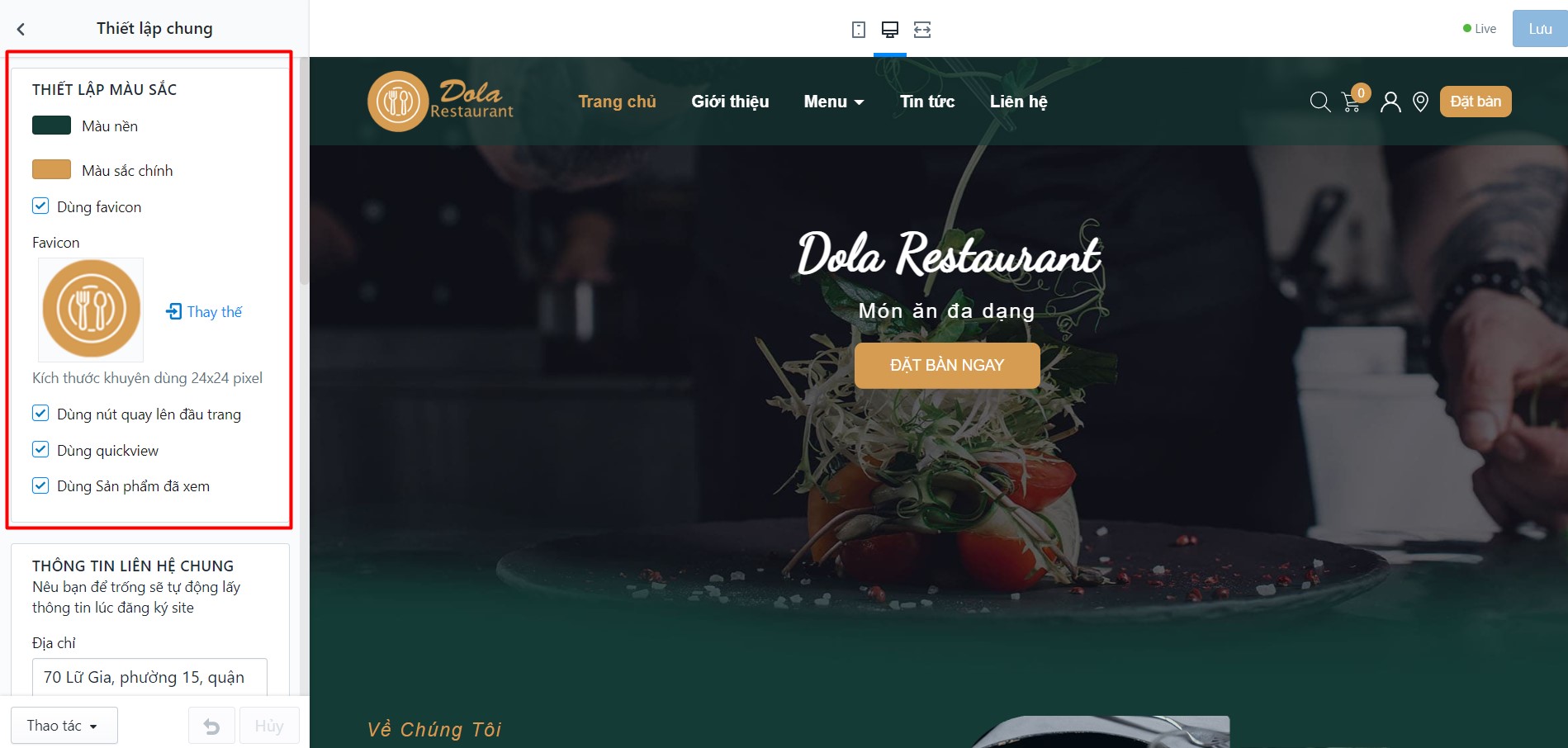 Tại đây bạn có thể thiết lập các tiêu đề, menu, kết nối mạng xã hội vv...