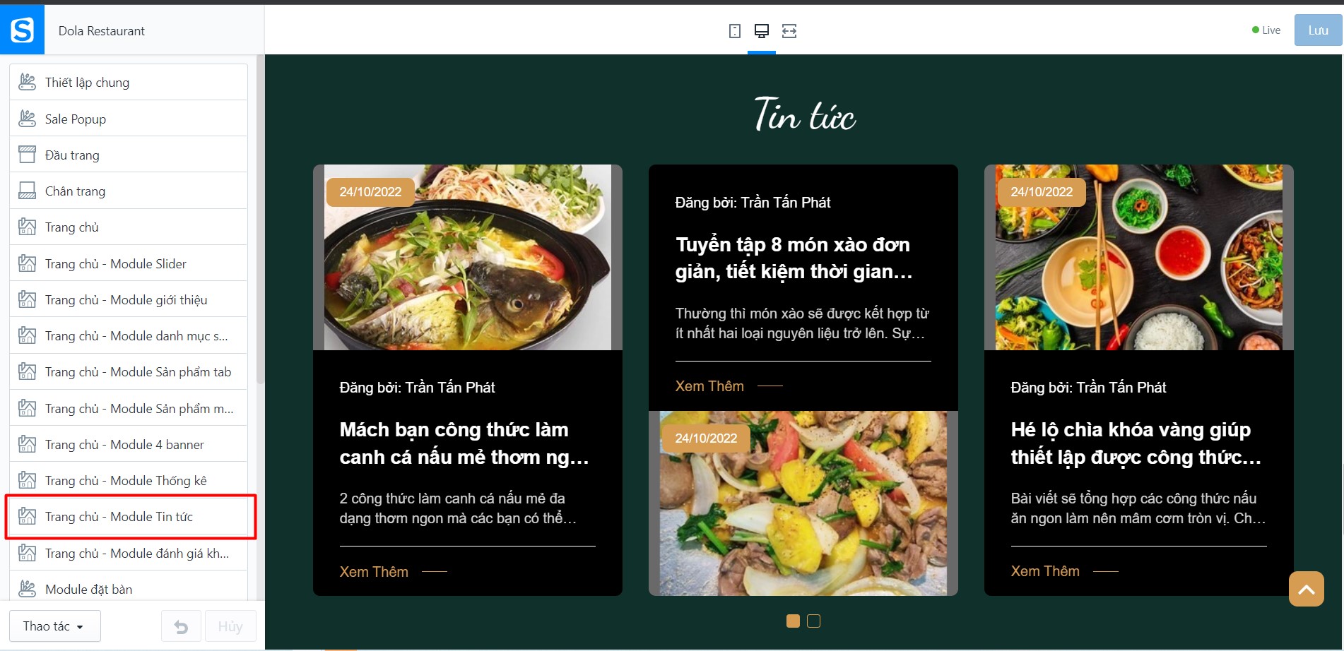 Tại đây bạn có thể thiết lập các tin tức nổi bật trong nhà hàng ...: