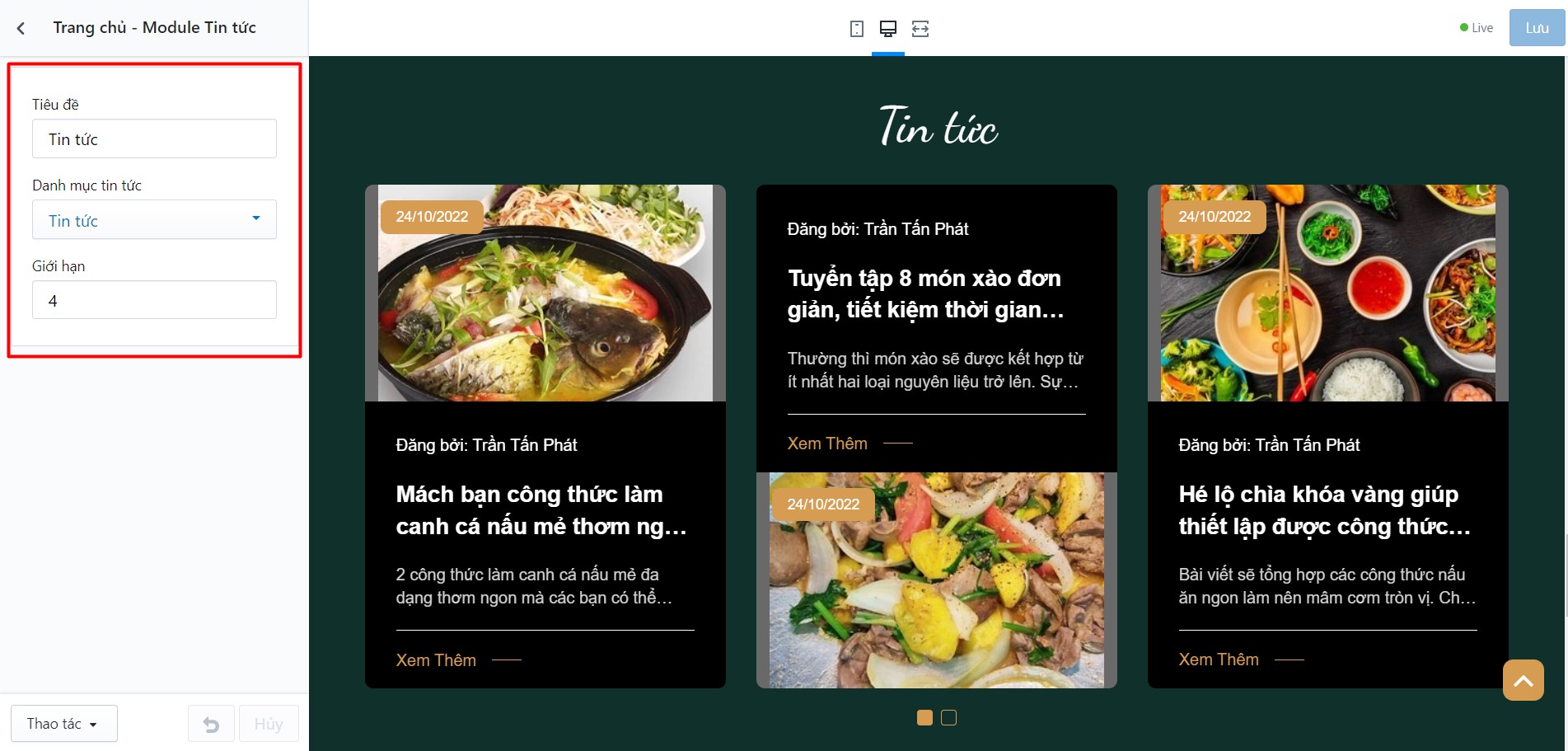 Tại đây, bạn có thể thiết lập số bài viết hiển thị trên 1 trang, danh mục, tin nổi bật