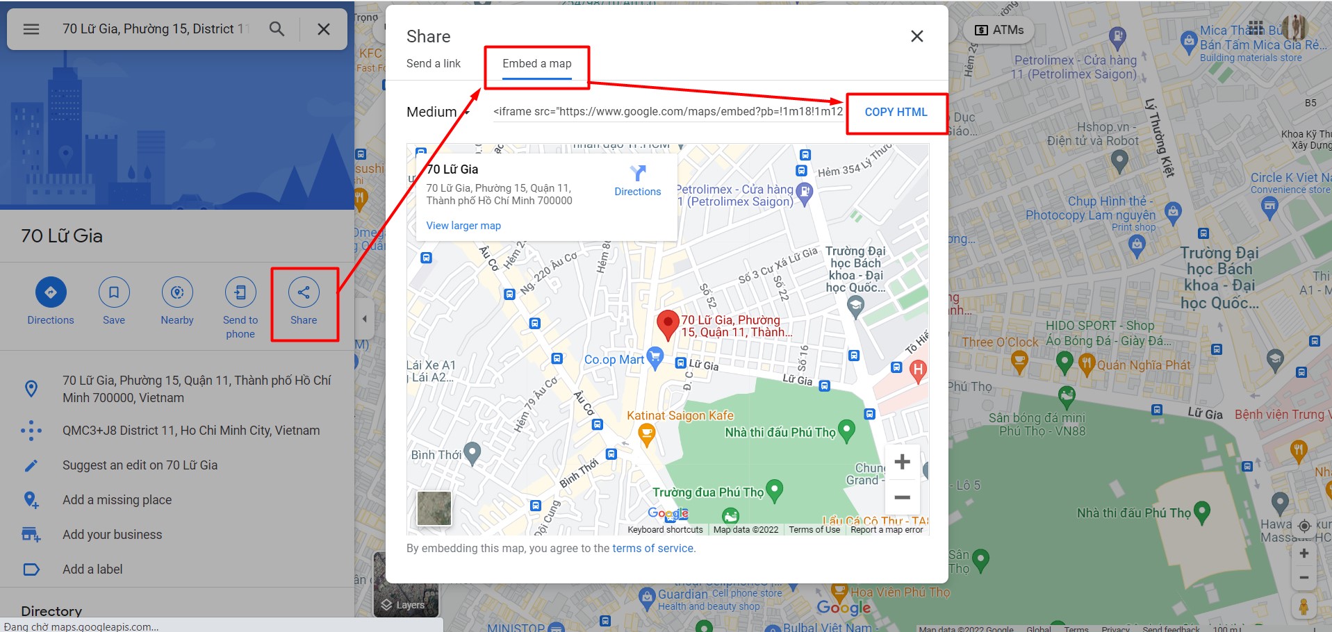 Thì chỉ lấy: https://www.google.com/maps/embed?pb=!1m18!1m12!1m3!1d3919.5181702233717!2d106.65107481440897!3d10.771568592324822!2m3!1f0!2f0!3f0!3m2!1i1024!2i768!4f13.1!3m3!1m2!1s0x31752ec07488c543%3A0x7dc9617e924ddb50!2zNzAgTOG7ryBHaWEsIFBoxrDhu51uZyAxNSwgUXXhuq1uIDExLCBUaMOgbmggcGjhu5EgSOG7kyBDaMOtIE1pbmggNzAwMDAwLCBWaWV0bmFt!5e0!3m2!1sen!2s!4v1668009442373!5m2!1sen!2s