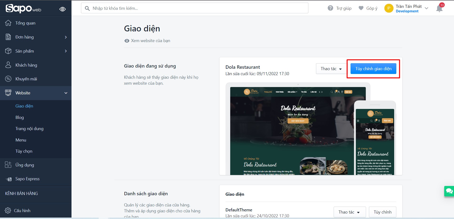 Sau khi cài đặt theme mới lên cửa hàng, bạn bấm vào TÙY CHỈNH GIAO DIỆN để tùy chỉnh theme: